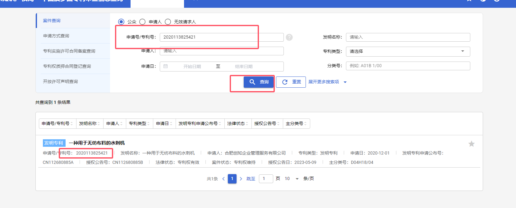 查询结果会显示专利的基本信息,包括授权状态、申请